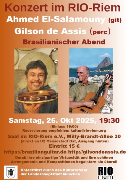 mit Ahmed El-Salamouny (git) und Gilson de Assis (perc) In ihrem Konzertprogramm stellen Ahmed und Gilson wunderschöne entspannte Bossa Novas, virtuose Sambas und romantische Choros vor. Sie spielen Eigenkompositionen aber auch Klassiker von Baden Powell oder Tom Jobim.Kurzportät Ahmed El-SalamounyKurzporträt Gilson de Assis Samstag, 25. Oktober, um 19.30 Uhr (Einlaß: 19.00 Uhr)Reservierung empfohlen unter kultur@rio-riem.orgim Saal des RIO-Riem e.V., Willy-Brandt-Allee…
